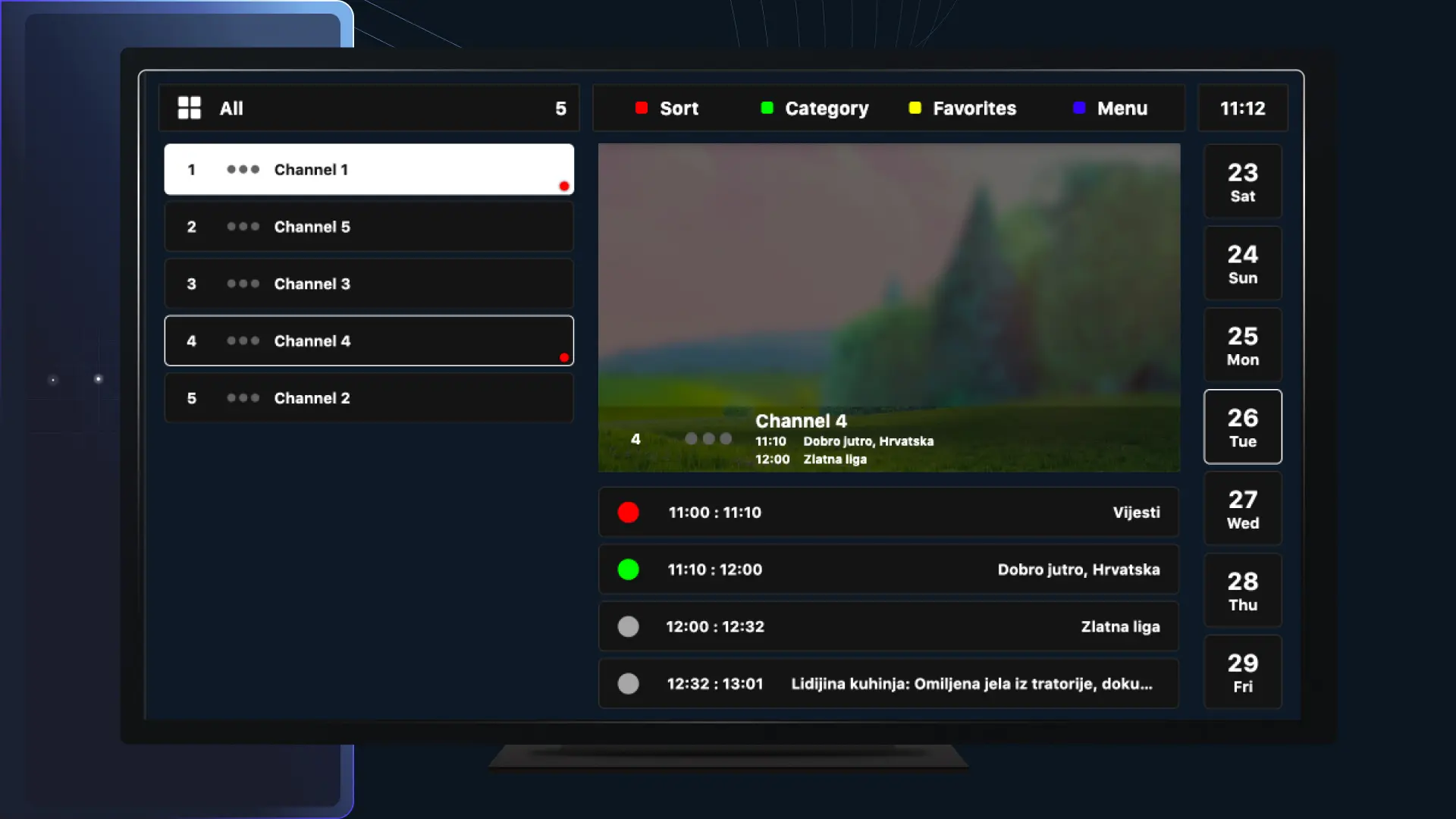 * Elektronik Program Rehberi (EPG): Tüm kanallardaki yaklaşan programların kapsamlı bir programına göz atın. Kanal, saat veya türe göre aradığınızı kolayca bulun. Ayrıntılı program açıklamalarını görün ve canlı ve arşiv içerikleri arasında sorunsuz bir şekilde geçiş yapın.